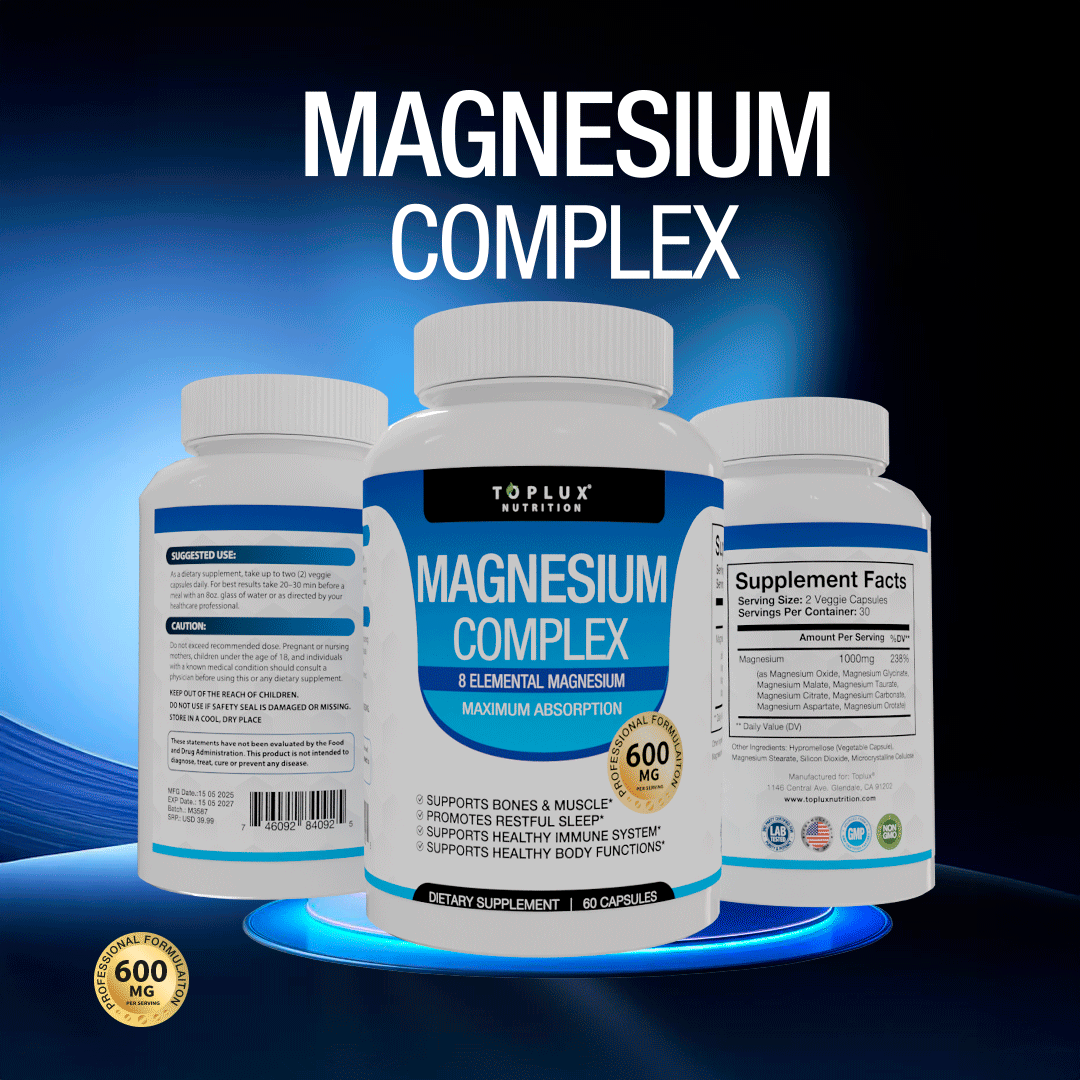 "Magnesium Complex de Toplux ayuda a mejorar la función muscular, reducir el estrés y promover un sueño reparador. Su fórmula de 8 tipos de magnesio asegura una absorción óptima, brindándote energía y bienestar de manera natural."