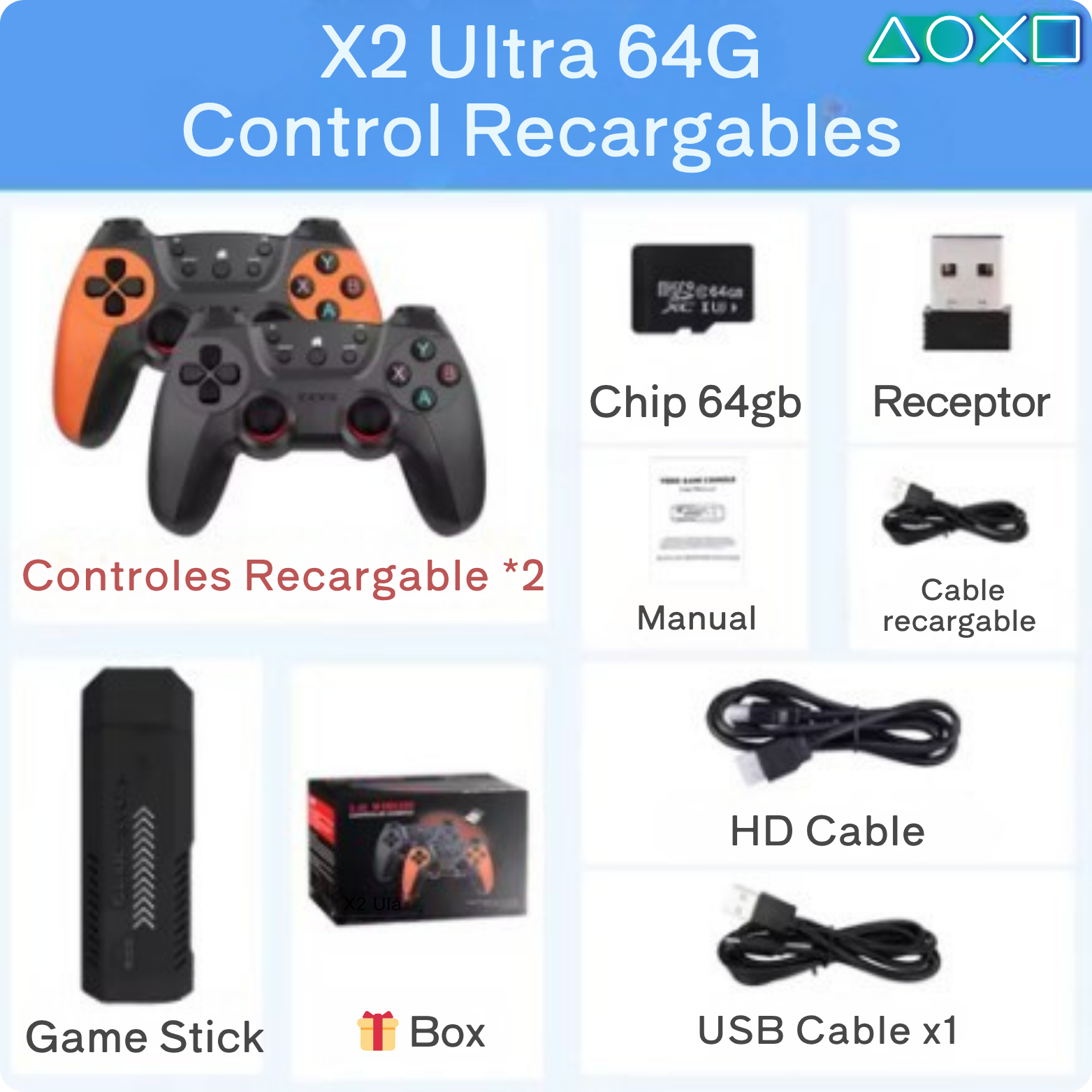 Incluye la consola X2 Ultra Gamers™, dos controles inalámbricos, cable HDMI, cable de carga y manual de uso. Todo lo que necesitas viene en la caja.